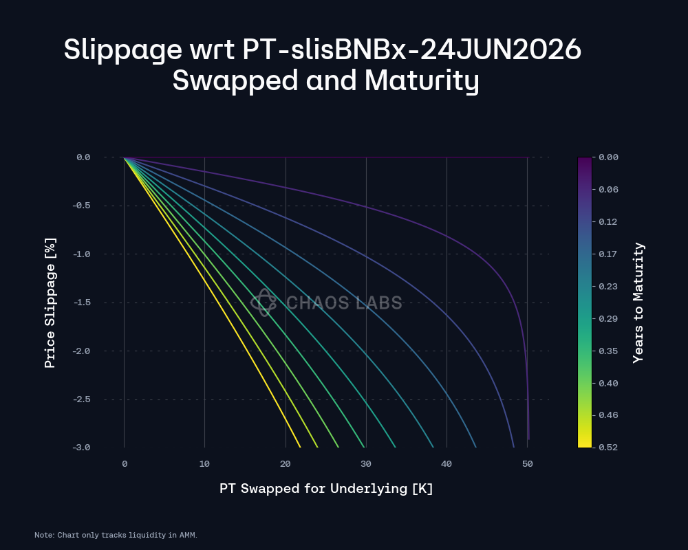 With PT-slisBNBx-24JUN2026, liquidity depends on both the underlying slisBNBx markets and Pendle’s PT/SY AMM pool, and current depth is solid. The plot below represents the amount of liquidity available under 3% slippage as the market approaches expiry, given the current liquidity distribution in the AMM. As the market matures and moves closer to expiry, the slippage associated with swapping PT becomes less extreme. This effect is more pronounced for assets with lower scalarRoot values, which correspond to a wider implied yield range and greater variability in liquidity concentration. Supported by on-chain liquidity in the Pendle AMM, the market currently facilitates swaps of up to 22K PT with less than 3% slippage.