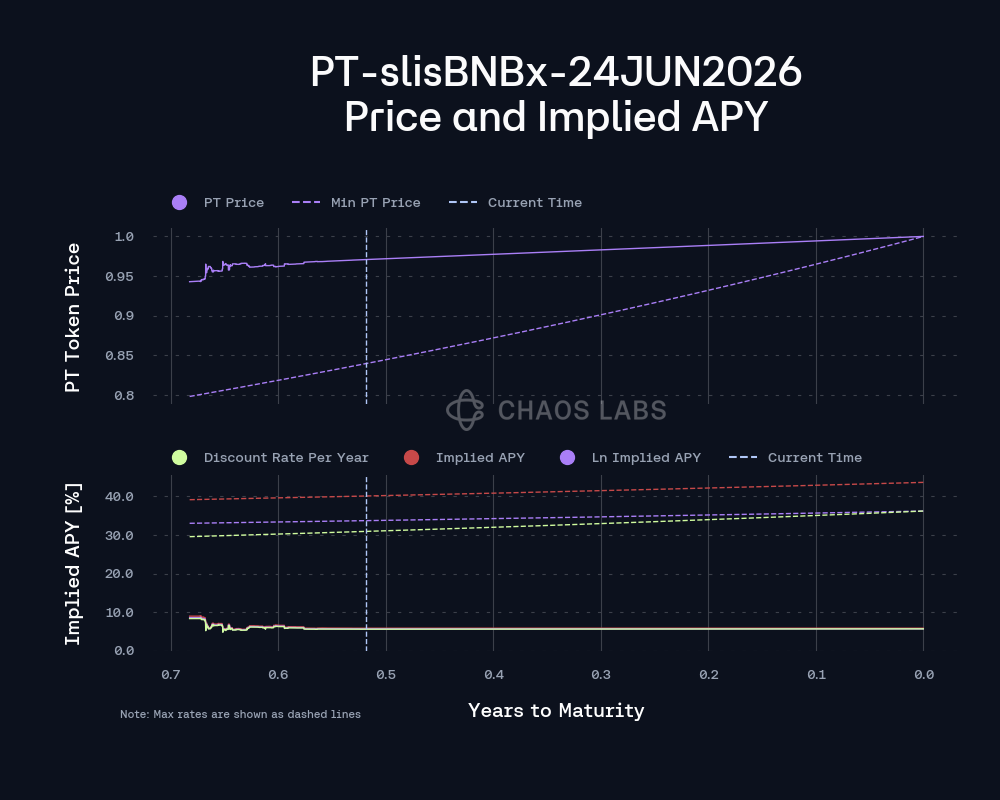 Structural safeguards ensure PT never exceeds 96% of pool value, preventing complete depletion of the SY side and capping the maximum yield the AMM can represent; when slisBNBx yields exceed this cap, PT can trade down to the AMM’s lower bound, with further trades occurring on Pendle’s order book. As time to maturity decreases, the discounting effect weakens, the minimum PT price increases, and PT-slisBNBx-24JUN2026 naturally converges to SY-slisBNBx as the remaining yield approaches zero.