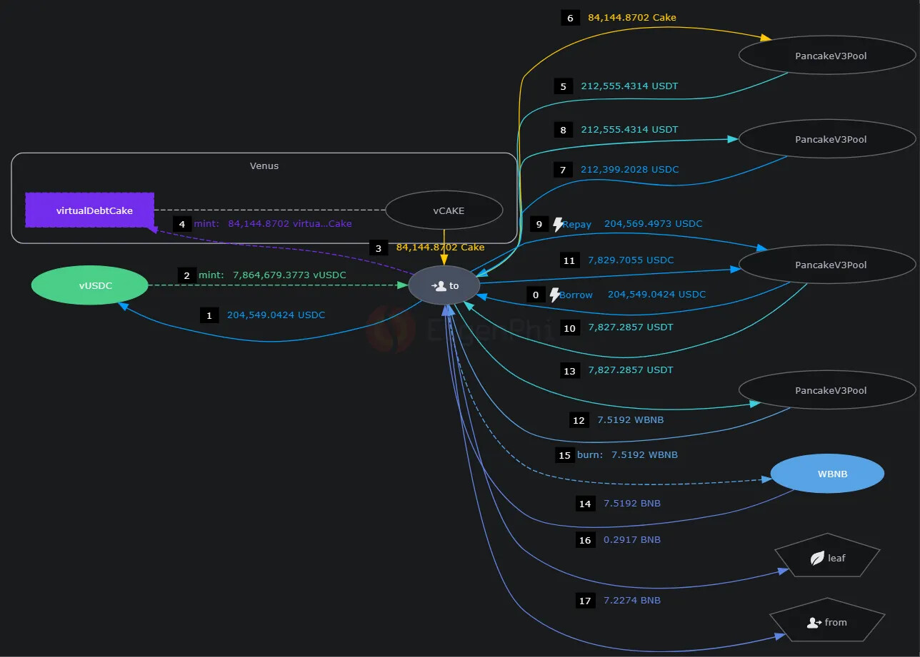 Due to the significant divergence between CAKE’s oracle-reported price and its actual market price on PancakeSwap, a user was able to exploit the price discrepancy. By borrowing CAKE against the artificially low oracle valuation and subsequently selling it on the open market at a higher price, the user effectively conducted an arbitrage against the Venus protocol. As a result, Venus incurred approximately $1.1M in bad debt as the oracle’s mechanics were taken advantage of.