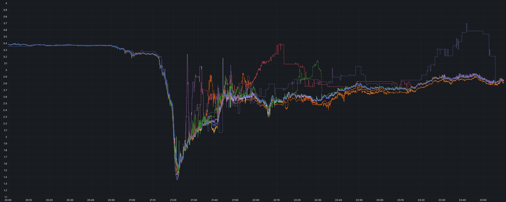 As shown in the chart below, the oracle price consistently traded below the market price, with an average dislocation of around 30% and a maximum dislocation of up to 40%. After 10:00 PM UTC, the oracle price and the secondary market price gradually returned to peg and stabilized.