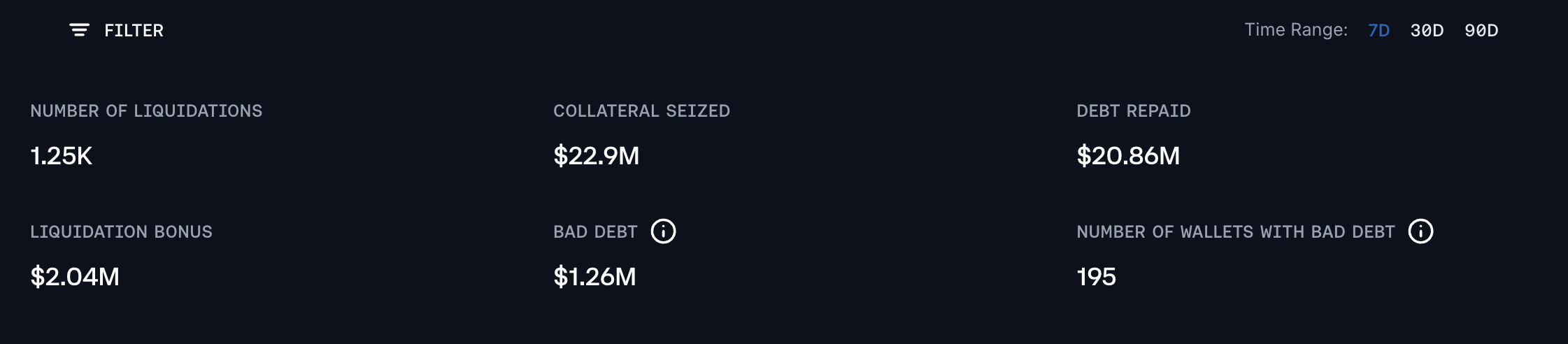 After President Trump announced new tariffs on Chinese imports, financial markets experienced one of the most abrupt and severe downturns in recent memory. In just 30 minutes, Bitcoin’s price dropped over 12%, falling from $116,500 to $102,700. Ether suffered an even sharper decline of around 20%, while several other assets lost more than 50% of their value within a 10-minute span during the same period. This sudden market disruption set off a chain reaction of liquidations across both DeFi and CeFi platforms. While the protocol has accrued approximately $1.38M of bad debt, the bonuses from the liquidations outpaced the deficit, resulting in net positive revenue.