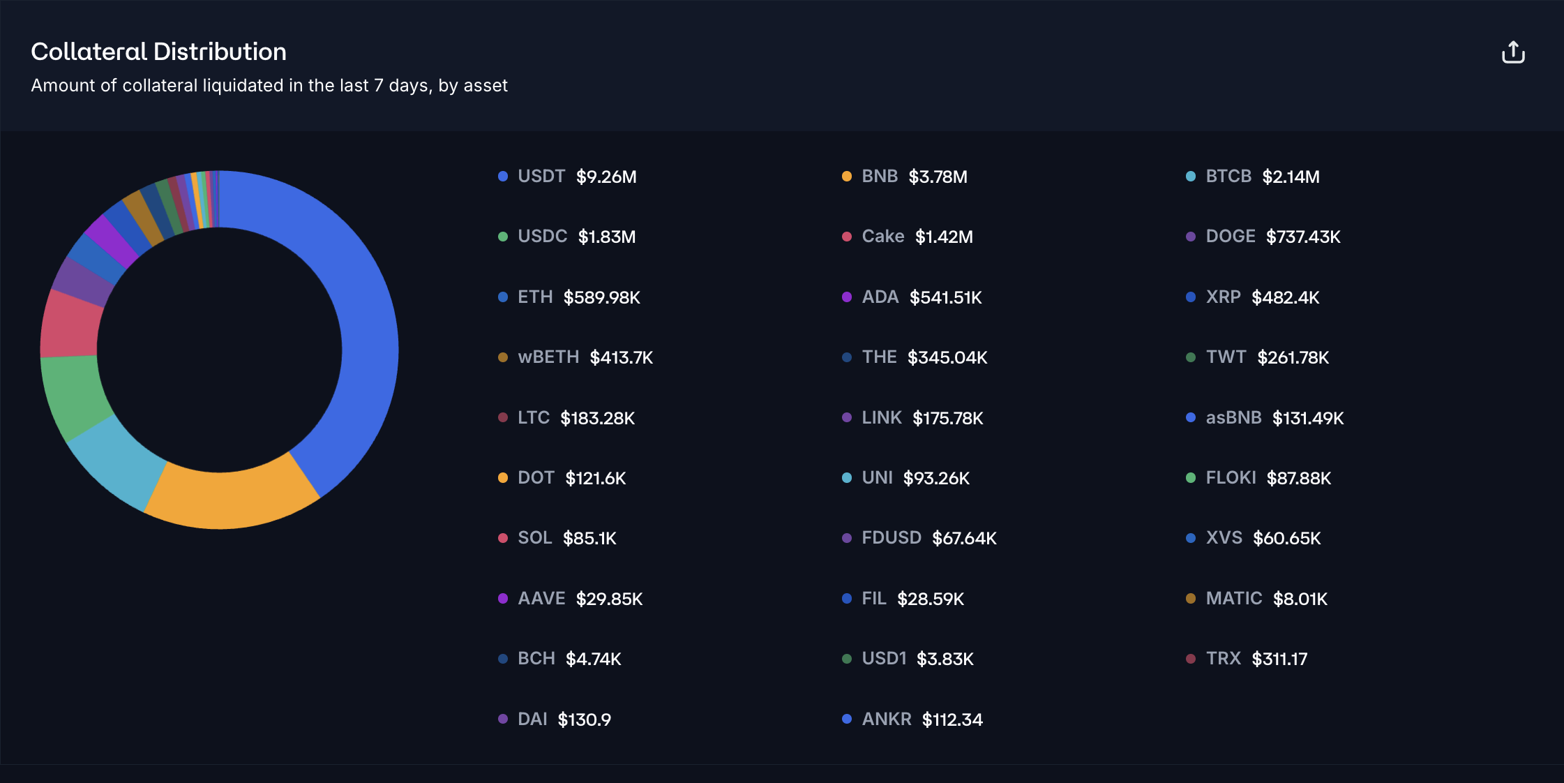 The rapid price action within the broader market has triggered a substantial wave of liquidations within the BNB Core Pool of Venus, primarily concentrated in USDT, BNB, BTCB, and USDC. The total number of liquidations reached 1.6K, while collateral seized exceeded $24M.