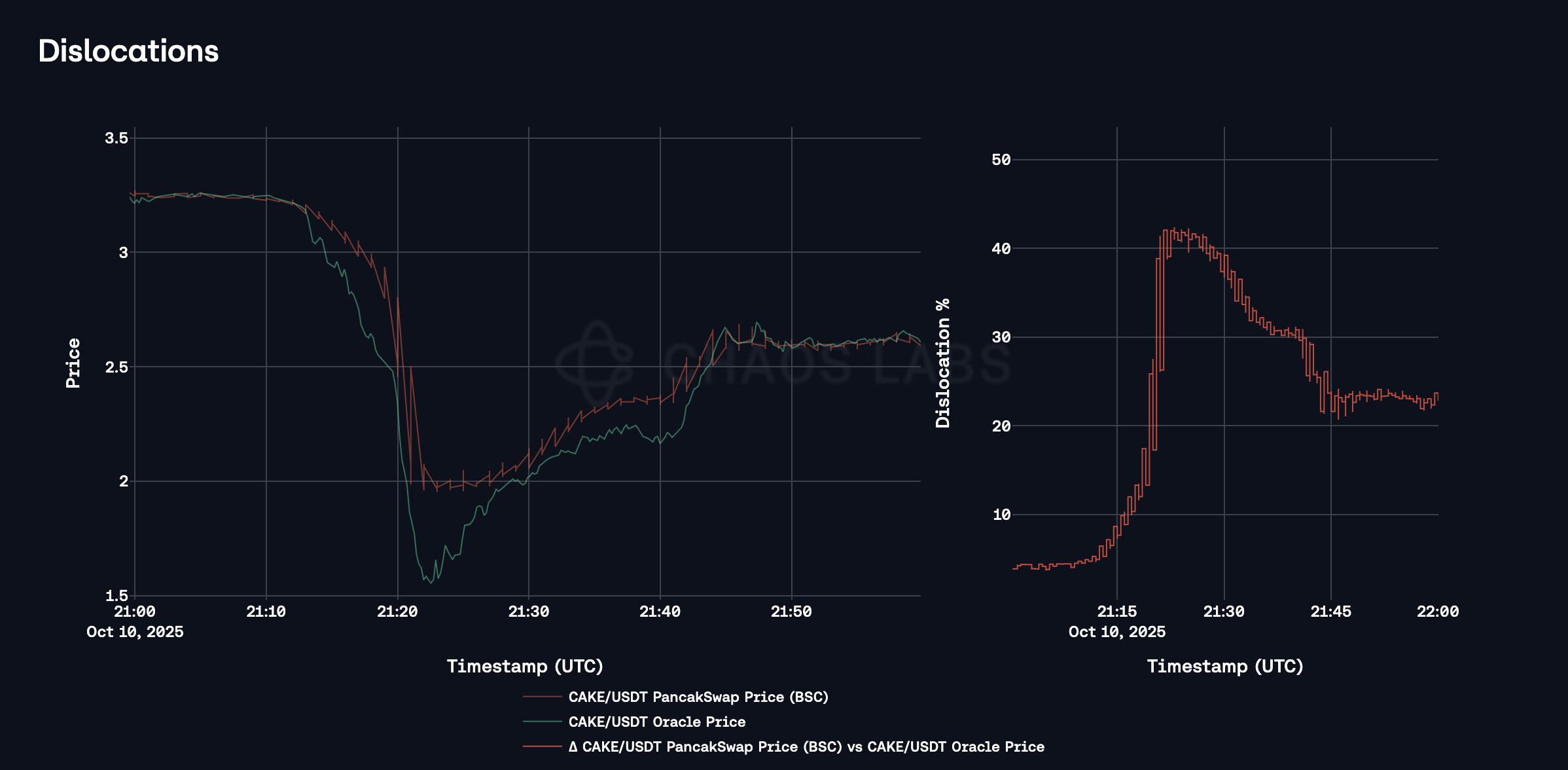 Venus experienced an oracle deviation of CAKE in this incident and, as a result, incurred around $1.1 worth of bad debt. Currently, Venus uses the Chainlink CAKE/USD oracle to determine the price of CAKE. However, between 8:30 PM and 10:00 PM UTC, the price reported by the Chainlink oracle significantly depegged from the effective market price of CAKE in the secondary market, specifically in the CAKE/USDT PancakeSwap liquidity pool.