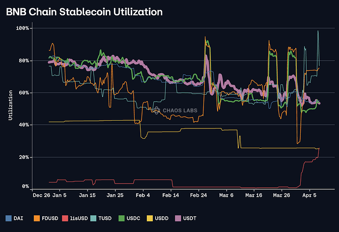 A closer examination of BNB Chain markets reveals that the downtrend has been displayed across all of the largest stablecoin markets; USDC and FDUSD have demonstrated the sharpest increases in utilization during Launchpool events.