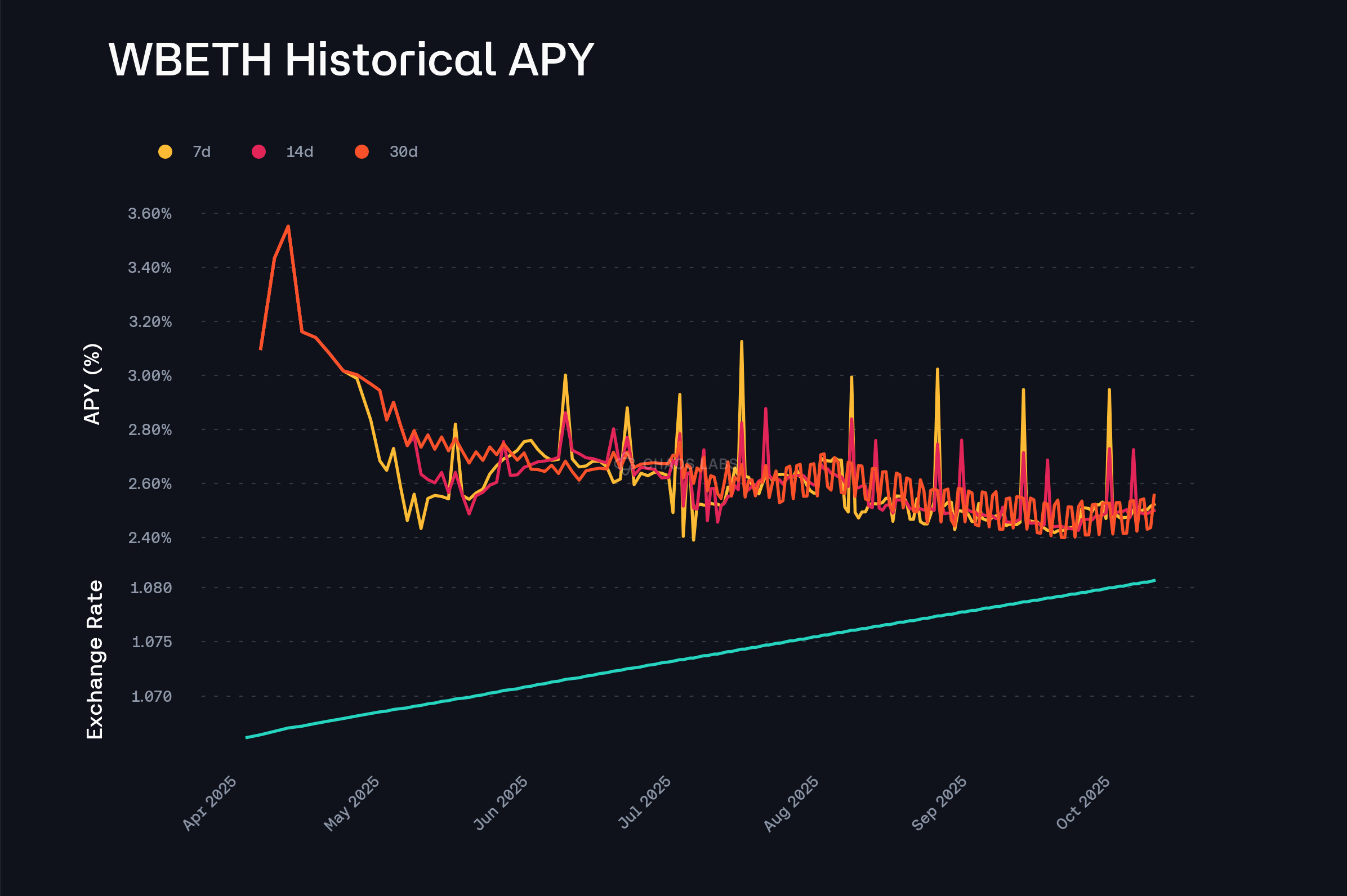 WBETH (Wrapped Beacon ETH) is Binance’s LST that represents ETH staked into Ethereum’s PoS network. Binance runs Ethereum validator nodes on behalf of users, covering slashing risk and removing the 32 ETH minimum, so users can stake any amount of ETH. When staking, users receive WBETH at the current WBETH:ETH exchange rate, where 1 WBETH equals 1 staked ETH plus all rewards accrued since April 27 2023. WBETH does not rebase; its value grows as the exchange rate increases daily.