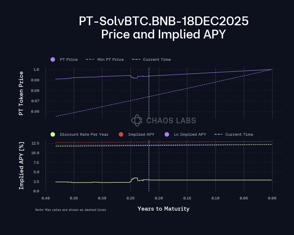 Like other Pendle PTs, PT-SolvBTC.BNB represents the discounted principal value of its underlying, converging to 1 at maturity on December 18, 2025. This convergence reflects the guaranteed redemption path of the underlying SolvBTC.BNB, with the pricing shaped by the implied yield and the time remaining to maturity. As with all PT tokens, the Pendle AMM progressively concentrates liquidity closer to parity as expiry approaches, ensuring more efficient pricing and reduced slippage near maturity.