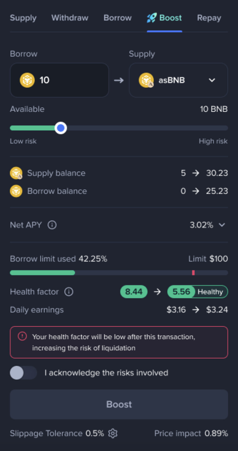From the user’s perspective, the process is simple and transparent. The interface shows the maximum boostable amount, resulting leverage, and updated health factor before confirmation.