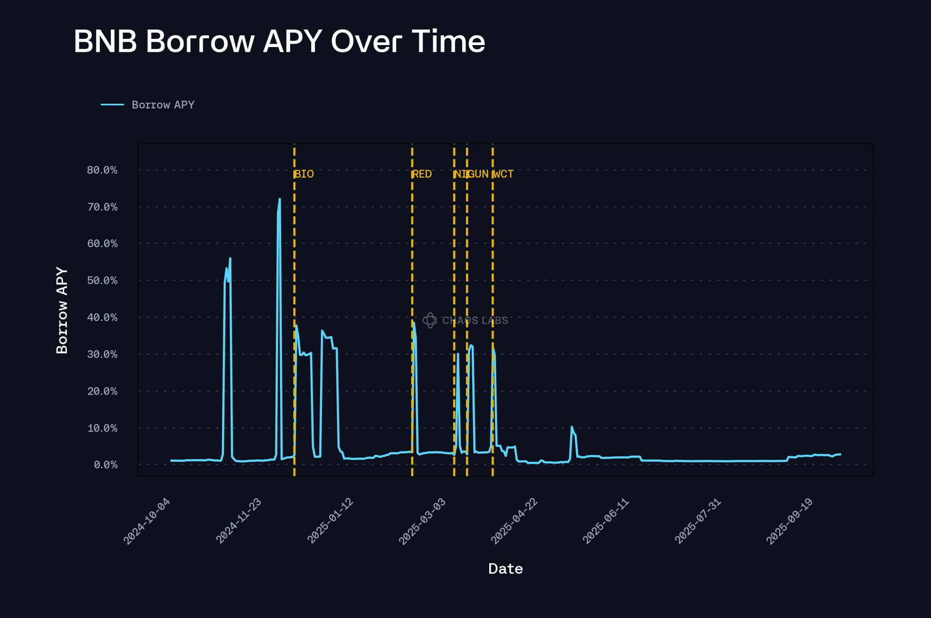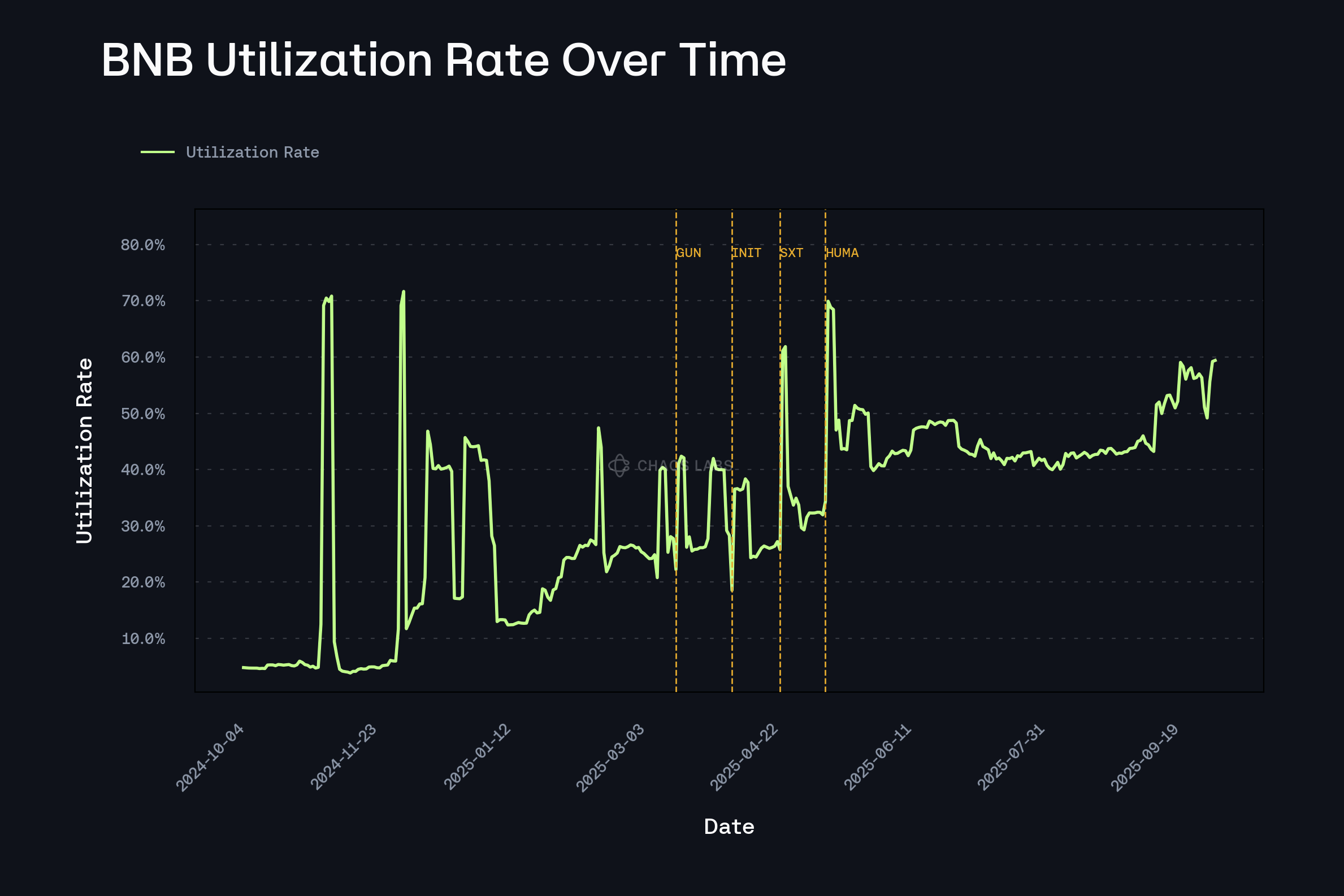 Other BNB borrowers, however, are not necessarily looping and may borrow for various purposes such as accessing liquidity, participating in BNB ecosystem incentive programs, or executing trading or hedging strategies, and therefore cannot be uniformly characterized. That said, past data shows that Binance LaunchPool has significantly influenced borrowing behavior on Venus: users borrowed large amounts of BNB ahead of LaunchPool events and locked it to harvest rewards. As shown, each time a Binance LaunchPool was announced, BNB borrowing spiked sharply. After the final LaunchPool ended in May 2025, BNB utilization no longer showed these surges and instead remained stable at around 50%.