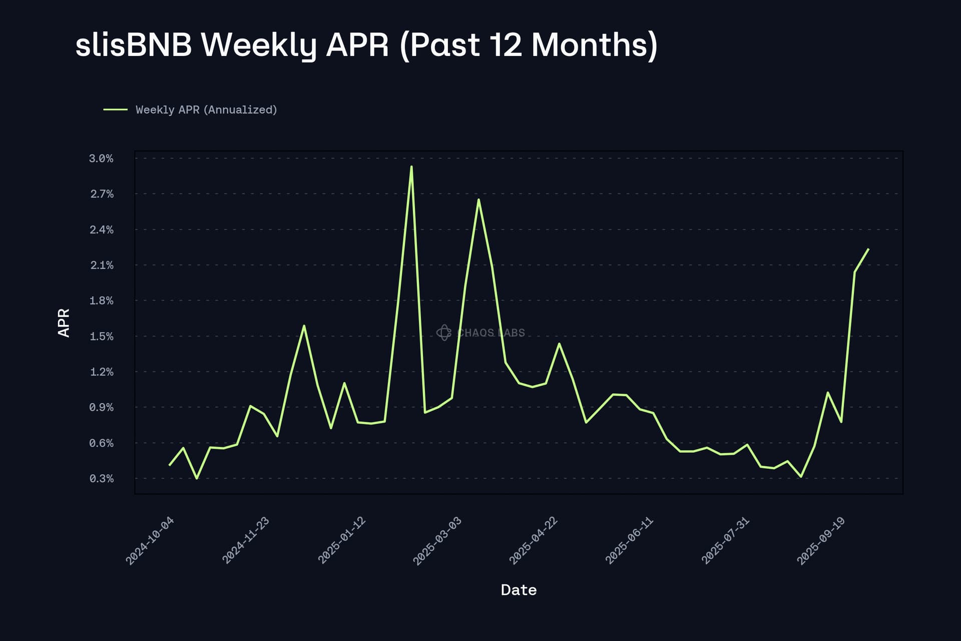 The chart below illustrates the yield behavior of slisBNB over the past year. As shown, the weekly averaged APR remained below 1.2% for the majority of the period, with notable spikes above 2% observed in January, March, and October of 2025.