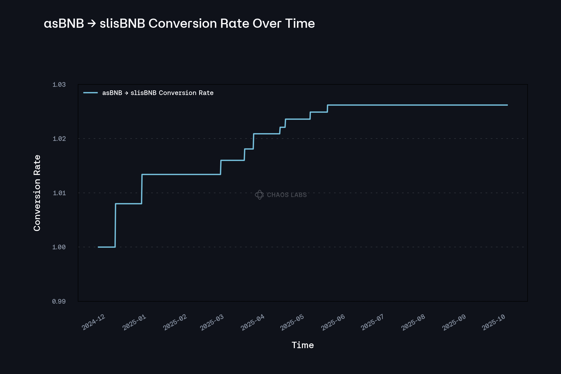As a result of this mechanism, after the final Launchpool event ended in May 2025, asBNB stopped accumulating rewards into its backing, causing its exchange rate to flatten. As shown, the conversion rate from asBNB to slisBNB has remained unchanged over the past five months.