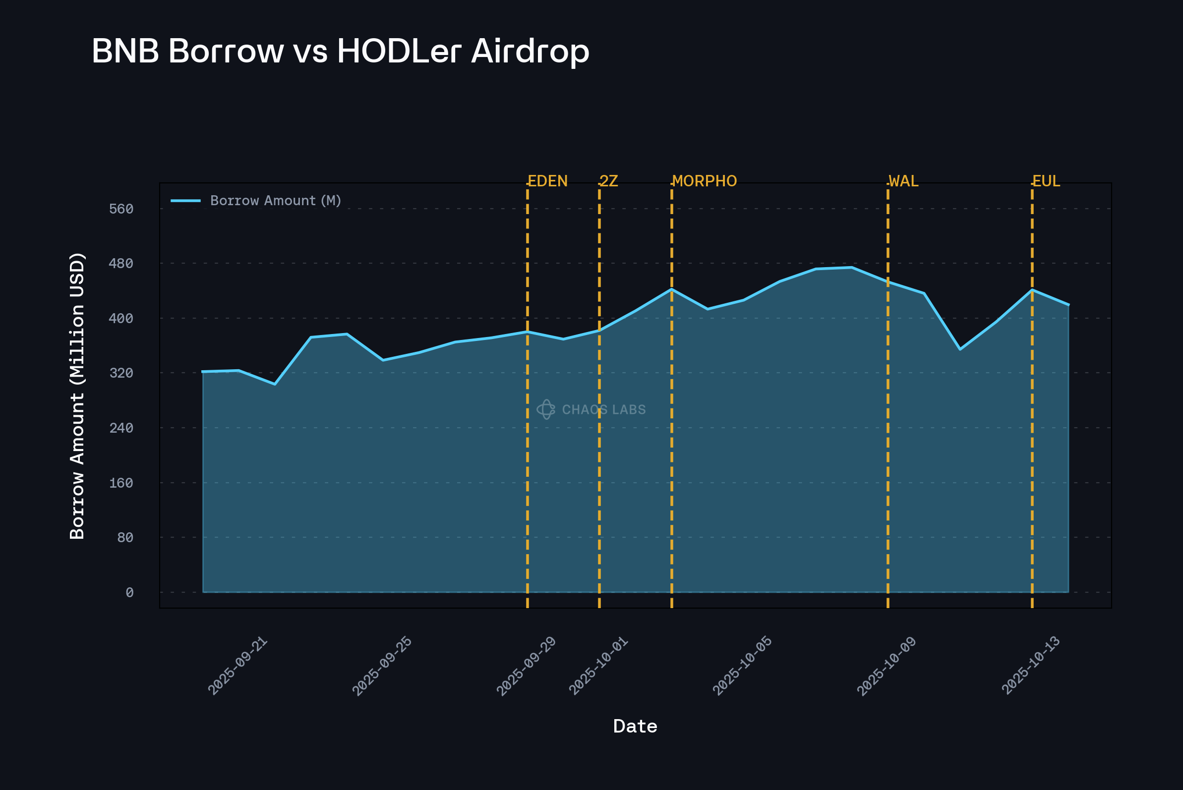 Binance HODLer Airdrops is a program that retroactively rewards BNB holders with newly listed project tokens based on historical snapshots of their BNB balances. Users do not need to take ongoing actions; participation is automatic as long as their BNB is subscribed to Simple Earn (Flexible or Locked) or On Chain Yields during the snapshot window. Binance takes multiple randomized balance snapshots over several days, then allocates the airdrop proportionally using each user’s average BNB balance. This means users do not receive advance announcements of HODLer Airdrops before the eligibility snapshot period begins, which significantly reduces the likelihood of users borrowing large amounts of BNB or WBNB in the short term just to qualify. As shown in the chart, the yellow lines mark the announcement times of the last five HODLer Airdrops. It is clear that BNB borrowing did not increase following these announcements.