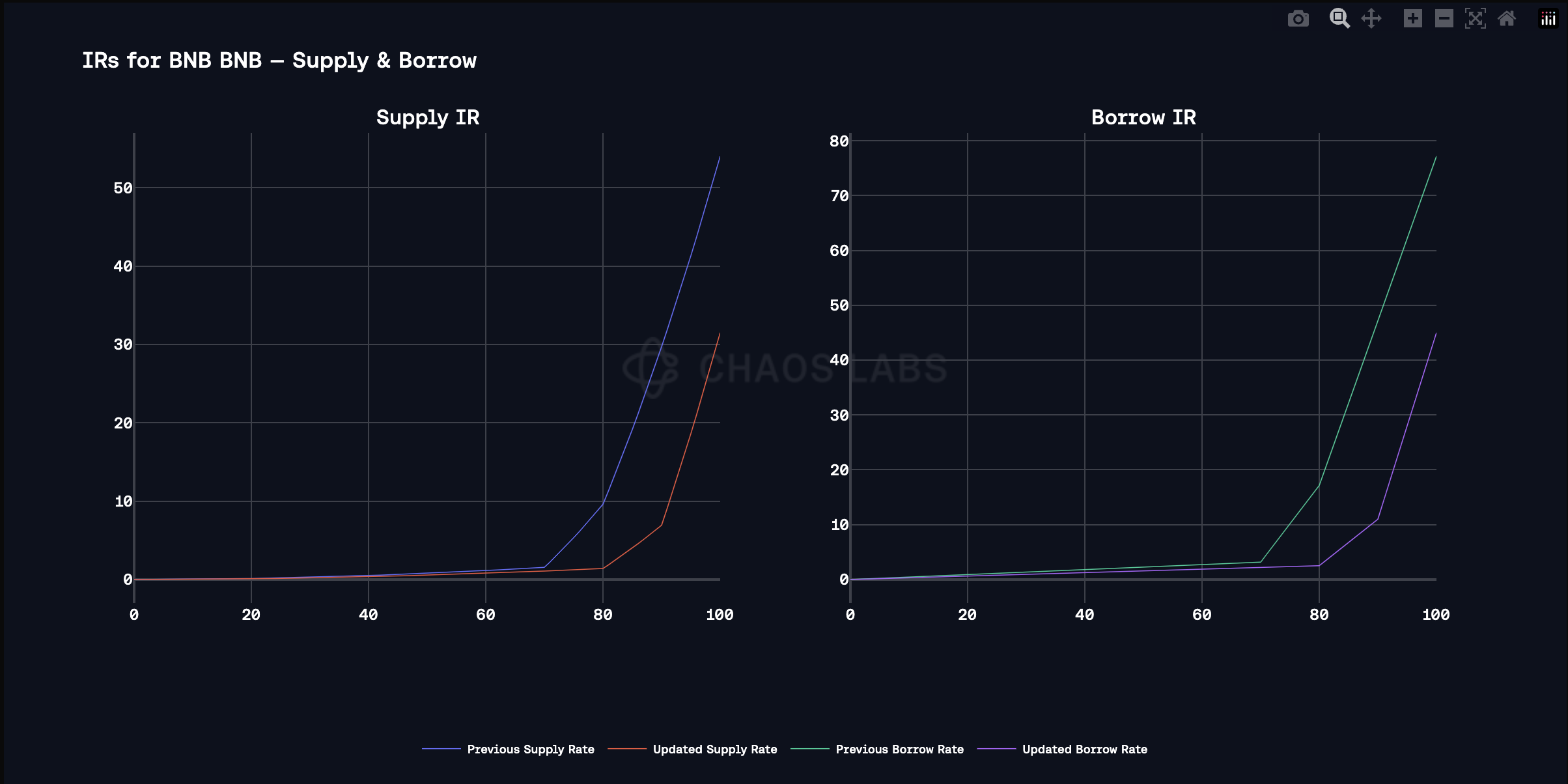 That said, the effectiveness of this market migration framework hinges on WBNB utilization achieving the targeted 80%. In a fully efficient market and under the current configuration, this outcome is expected. However, if utilization remains below expectations post-implementation and the anticipated spread fails to materialize, Chaos Labs will reassess and adjust the WBNB borrow rate as necessary to restore optimal utilization.