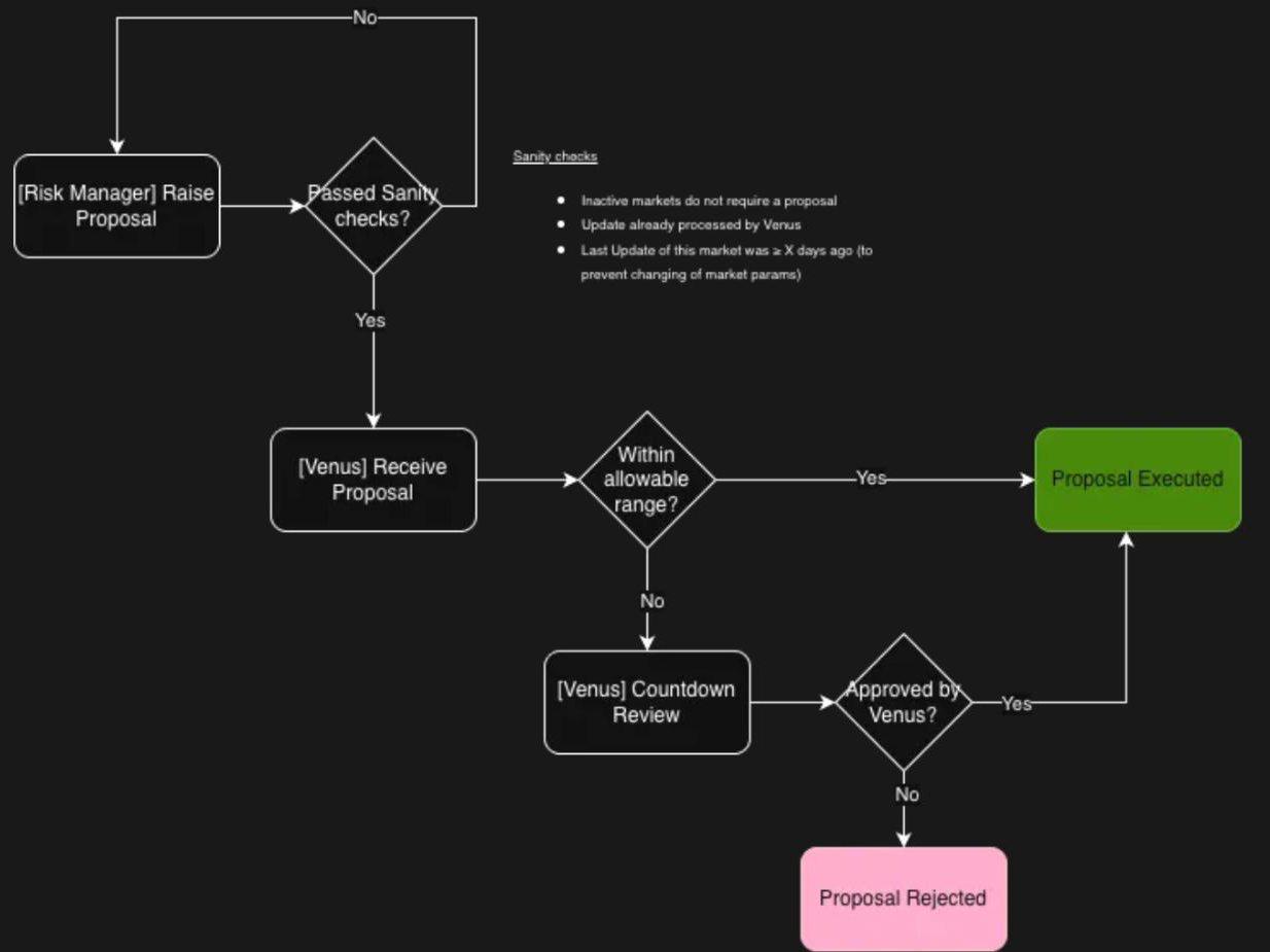 For certain parameters, changes within predefined ranges can be reviewed and executed more quickly. For larger or more impactful changes, a review window applies, during which Venus can approve or reject the proposal. Some parameter changes may still require longer review periods due to their complexity.