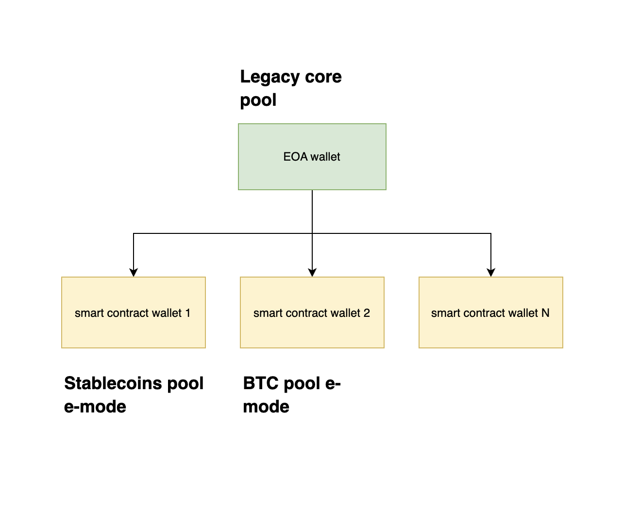 Enable users to create multiple smart contract wallets controlled by one primary wallet. Each wallet can access different Venus pools, including eMode-enabled pools, while the main wallet manages all interactions. Main wallet can still utilize any of the Venus pools.