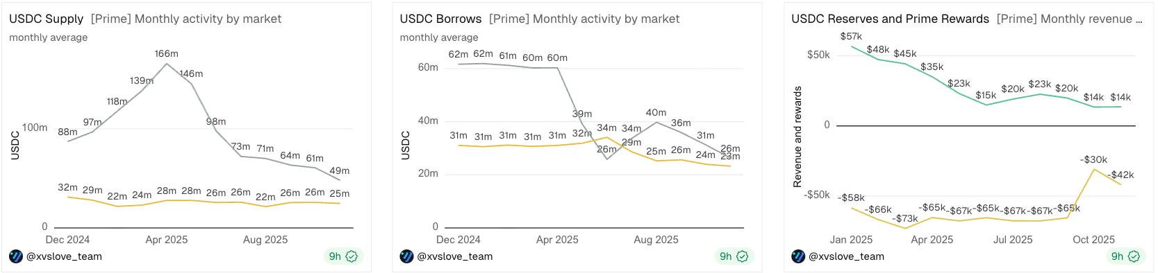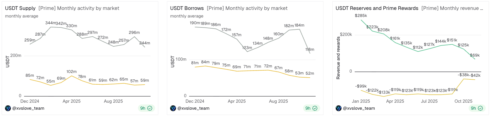 In November, the Prime rewards allocation strategy was adjusted to align incentive levels with current revenue, directing rewards exclusively to USDT and USDC suppliers while pausing incentives for all other markets.